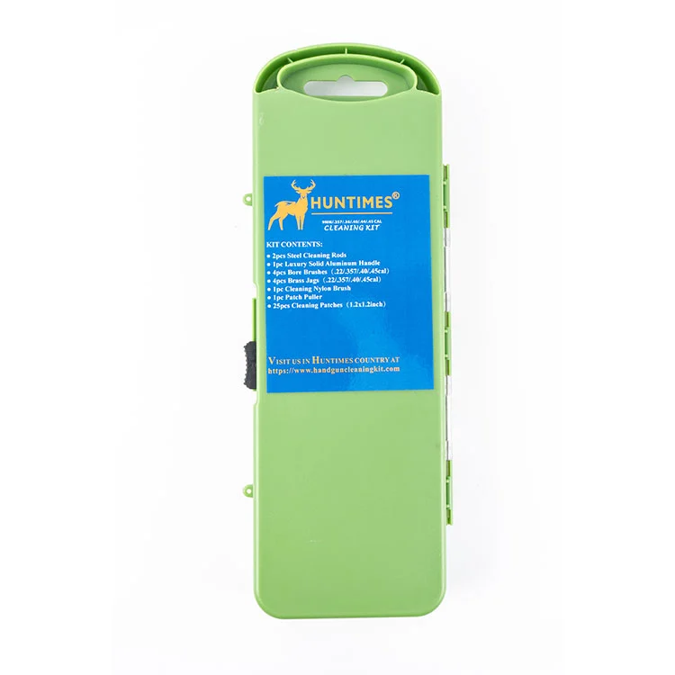 Meie 9MM/.357/.38/.40/.44/.45 kaliibriga puhastuskomplekt, mis on loodud teie püstoli jaoks ja millel on OEM-i kohandatud käepideme logo ja pakend. See mitmekülgne puhastuskomplekt sobib suurepäraselt jahihuvilistele ja kaasas on teie konkreetsetele vajadustele kohandatud tarvikute komplekt. Komplekti kuulub kaks messingist puhastusvarda, vastupidav plastikust käepide, puhastusnailonhari, kakskümmend viis puhastusplaastrit, neli erineva kaliibriga kambriharja, neli messinghammastust, plastikust plaastri tõmmits ja messingist plaastri tõmmits.